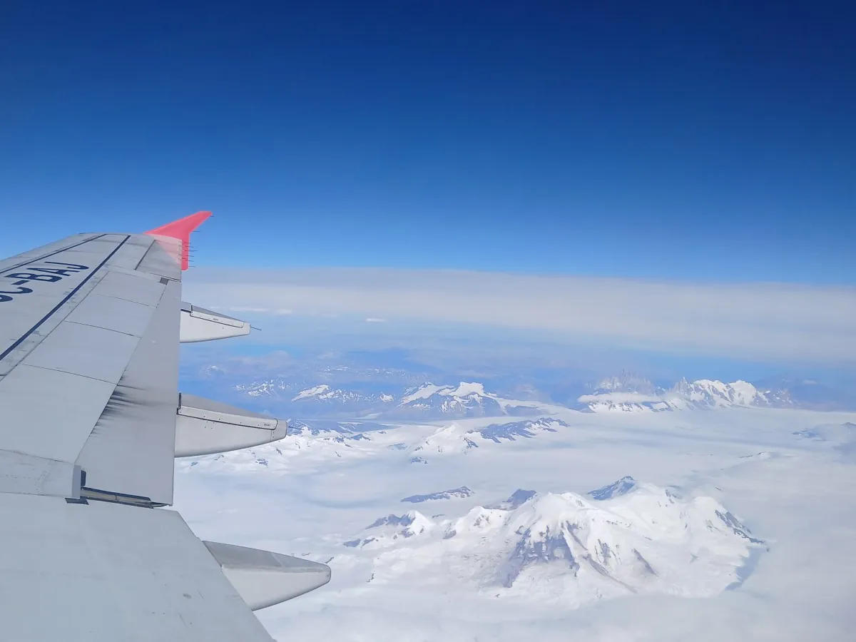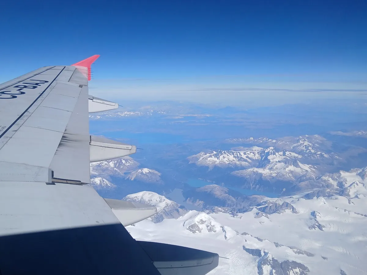 Pfiouuuu, la dépose bagage est super longue loll Pas bcp de monde mais le personnel discute, s’absente… Quasiment 1h. La coolitude de Punta Arenas, il n’y a pas beaucoup de vols par jour, ceci explique cela. Décollage un peu en retard, 3h de vol pour rejoindre Santiago, à 3 000 km au nord. J’ai pris un hublot pr une fois et j’ai bien fait. Le ciel est dégagé et la vue est magnifique : on survole d’abord le parc Torres del Paine puis on longe la Cordillère des Andes. Les sommets enneigés dépassent un peu des nuages, c’est magnifique !