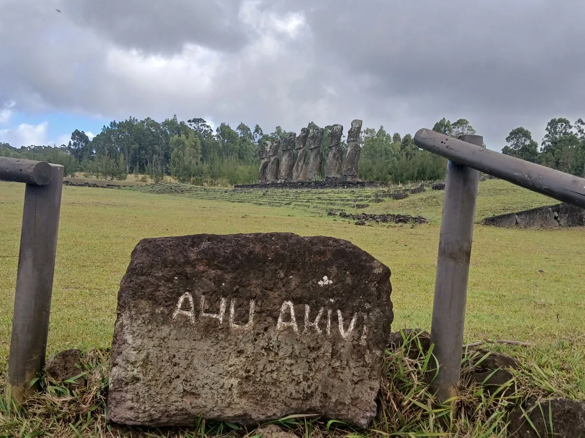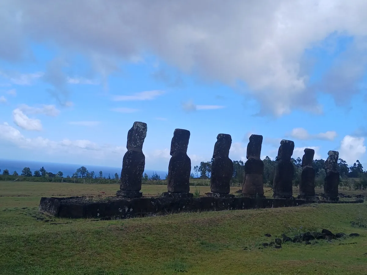 - Ahu Akivi : c’est le 1er site à avoir été restauré scientifiquement en 1960 et c’est le seul dont l’alignement des statues soit tourné vers la mer. Mais en fait, il y avait un village entre eux et la mer donc ils surveillaient le village. Il y a 7 moaï, hauts de 4 m.