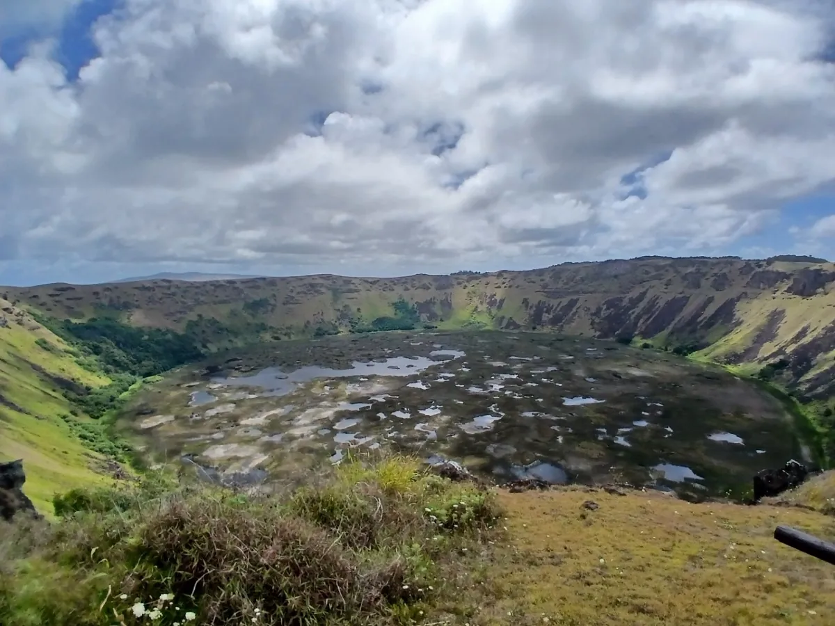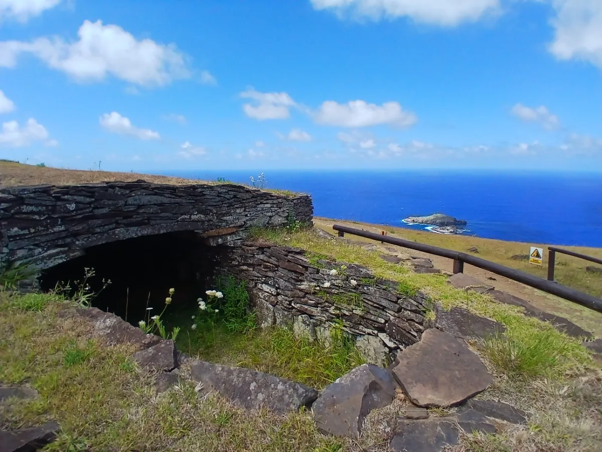 - Volcan Rano Kau et village d’Orongo : c’est le volcan où je suis allée l’autre jour mais cette fois, on va le voir depuis le village d’Orongo (guide obligatoire). Ce village était un village cérémoniel. Les archéologues y ont trouvé 53 maisons basses en pierre de basalte. Elles n’étaient occupées qu’au printemps durant les cérémonies de l’Homme-Oiseau (Tangata Manu). C’était une compétition rituelle où des guerriers de clans rivaux cherchaient le premier œuf de sterne manutara. Le clan du vainqueur obtenait le pouvoir politique et religieux sur l’île pour une année.