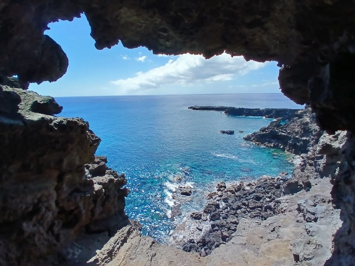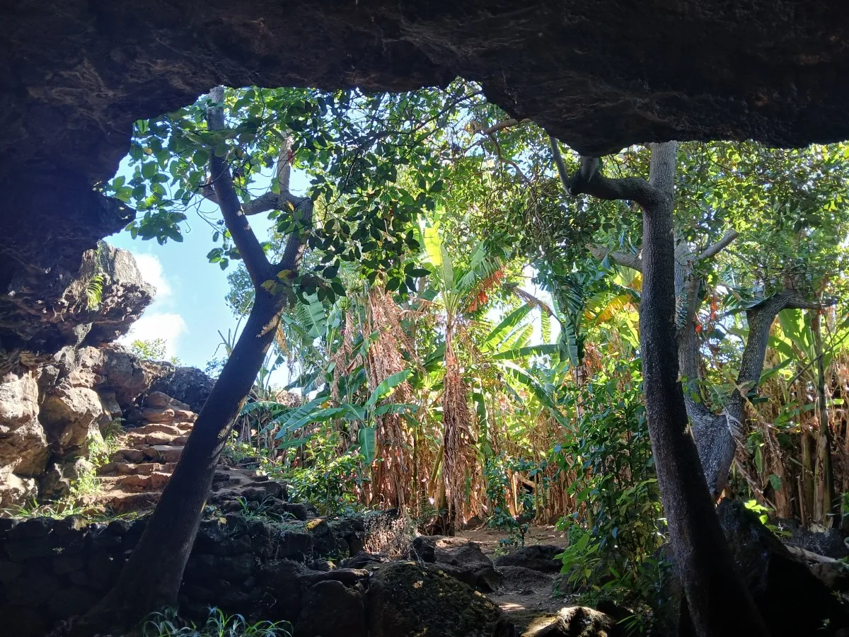 - Ana Kakenga : on laisse les sacs dehors et il faut se tortiller pr descendre, un étroit boyau permet d’accéder à une caverne longue d’une trentaine de mètres. Il s’agit d’un tunnel de lave formé par une coulée volcanique qui s’est refroidie en surface. La lave s’est écoulée jusqu’à la mer, en creusant 2 ouvertures qui donnent une vue de dingue.