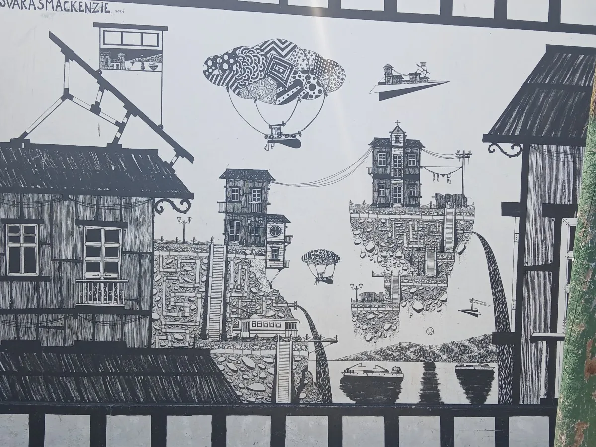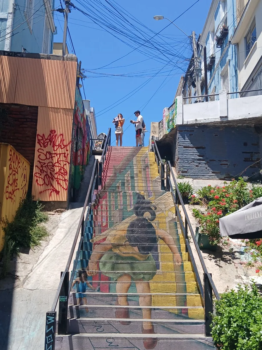 Valparaiso est posée le long d’une baie en demi-lune et compte 45 collines (cerros), naguère sauvages, aujourd’hui toutes très urbanisées, et de manière très anarchiques. La ville basse, c’est un énorme port avec ses quais, ses cargos, ses conteneurs, ses grues… Plusieurs funiculaires desservent les cerros (mais seuls 6 sont encore en état de fonctionnement). Valpo, comme les locaux disent, a connu une longue période de déclin et de paupérisation, elle se redynamise depuis 20 ans, notamment grâce à son inscription au Patrimoine de l’Unesco en 2003. Valpo se veut aujourd’hui étonnante, artistique, vivante, inventive et bohème, avec plein de street art. La ville est souvent soumise aux incendies et aux tremblements de terre, donc tout est construit en mode antisismique.
