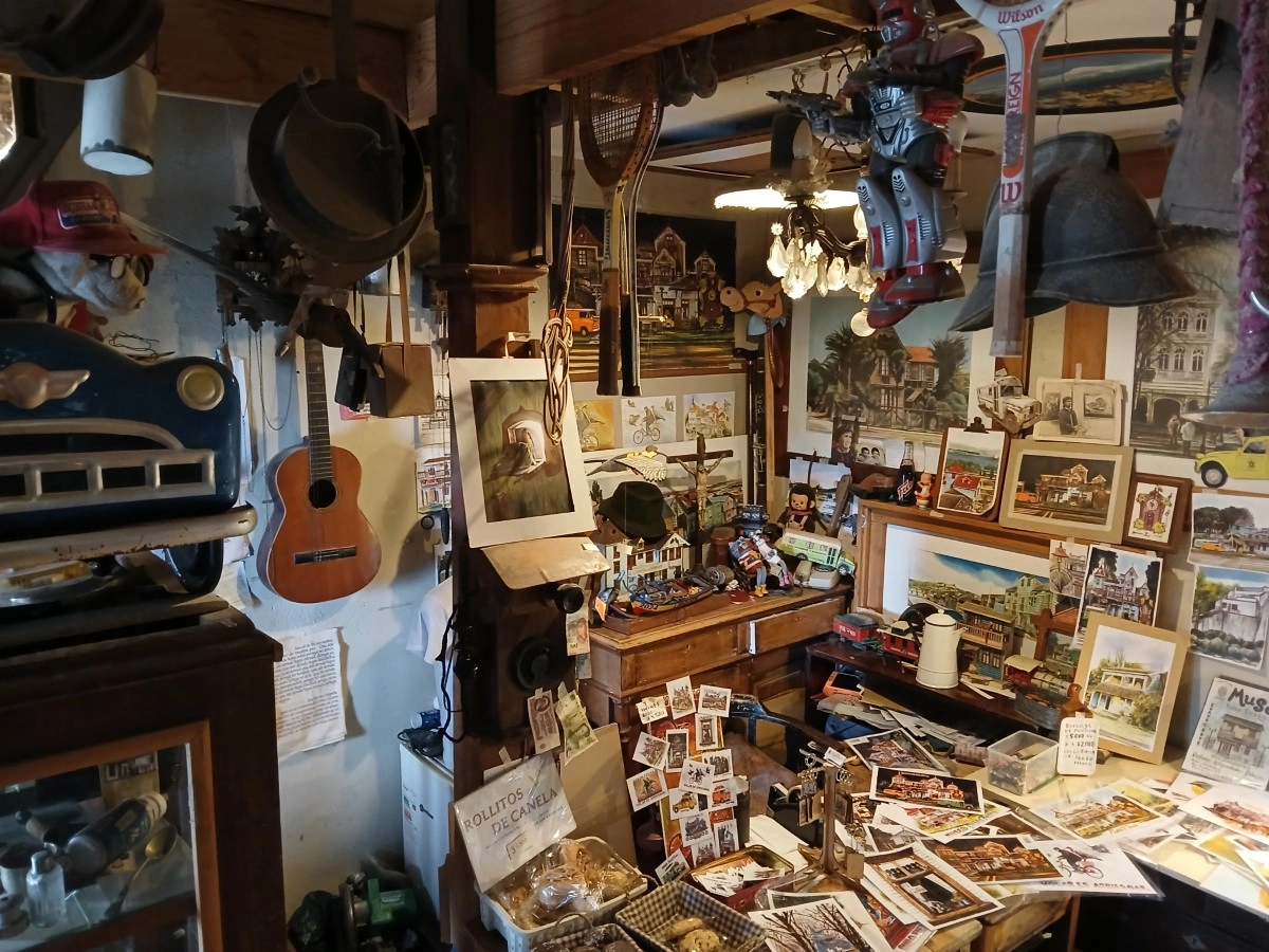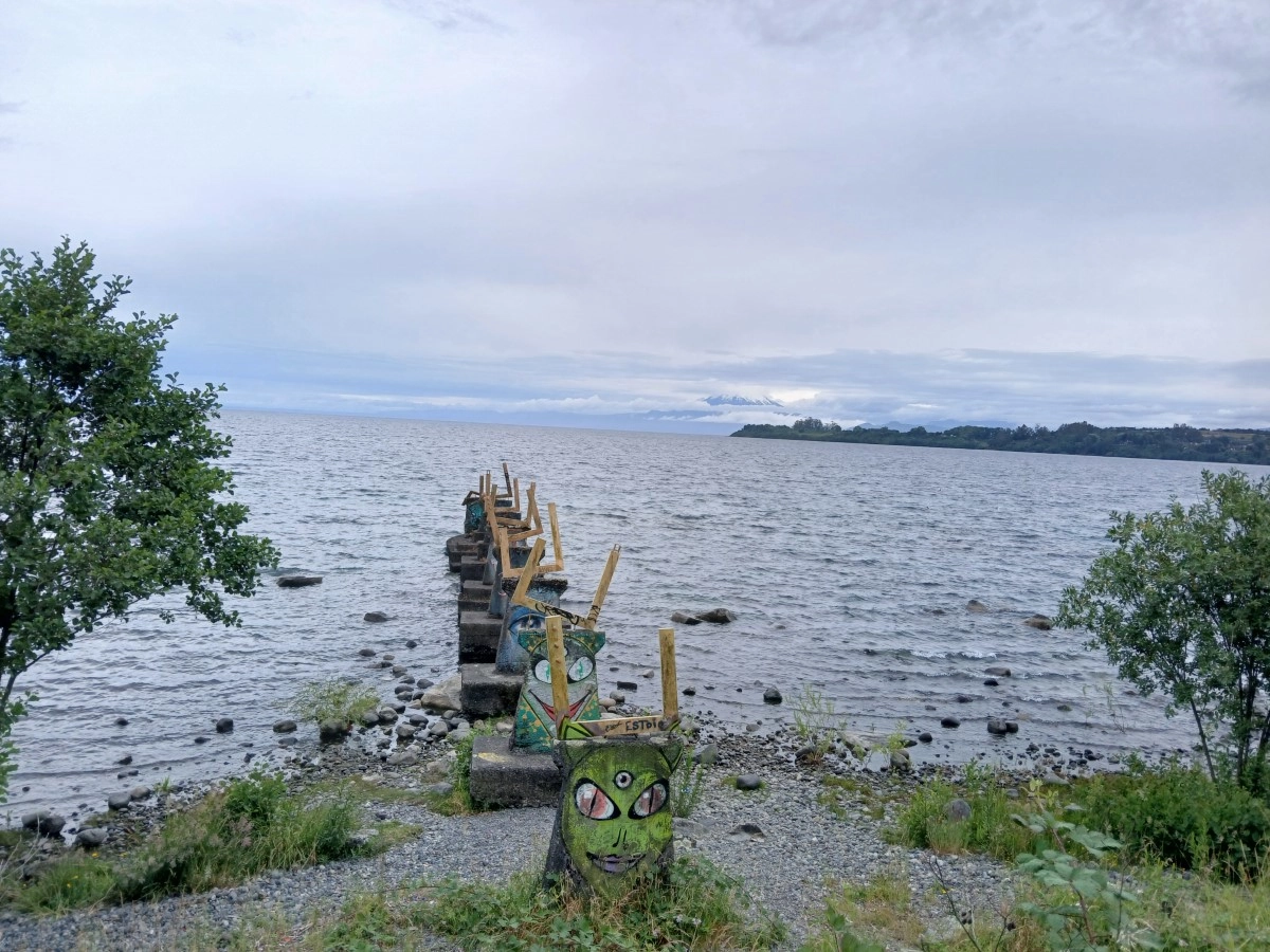 Une fois ce petit tour terminé, je vais marcher le long du lac. On aperçoit Orsono au gré des nuages. Je passe devant le musée Pablo Fierro qui est fermé donc je poursuis ma route. Petite balade sympa (8km)… Ca souffle aujourd’hui mais quelques chiliens sont posés au bord de l’eau. Au retour, le musée est ouvert. Il est gratuit et c’est davantage un incroyable bric-à-brac qu’un musée, mais c’est sympa. J’ai un peu faim… Je vais voir le resto Quintal qui est à côté mais malgré la lumière et des serveurs, la porte est fermée, il est pourtant 12h45, tant pis, je rentre au centre ville. Je regarde qq resto qui ne me donnent pas envie, burgers, sandwichs ou pizzas sur la plupart des menus. Et surprise, je tombe sur un resto bondé de chiliens, El Barista, avec un menu du jour à 12 000$ (les menus du jour sont le bon plan ici). Au menu : soupe de maïs ou ceviche de champignons, et poisson ou viande avec une boisson. Pour moi ça sera ceviche, viande et un verre de vin rouge. Il est délicieux et ils servent généreusement ici ! Ambiance sympa et service rapide. Ah les prévisions météo avaient raison, il se met à pleuvoir donc 15h, retour à l’hostel et aprèm au calme, notamment pour finir de gérer mes résa. Glande et soirée au calme.